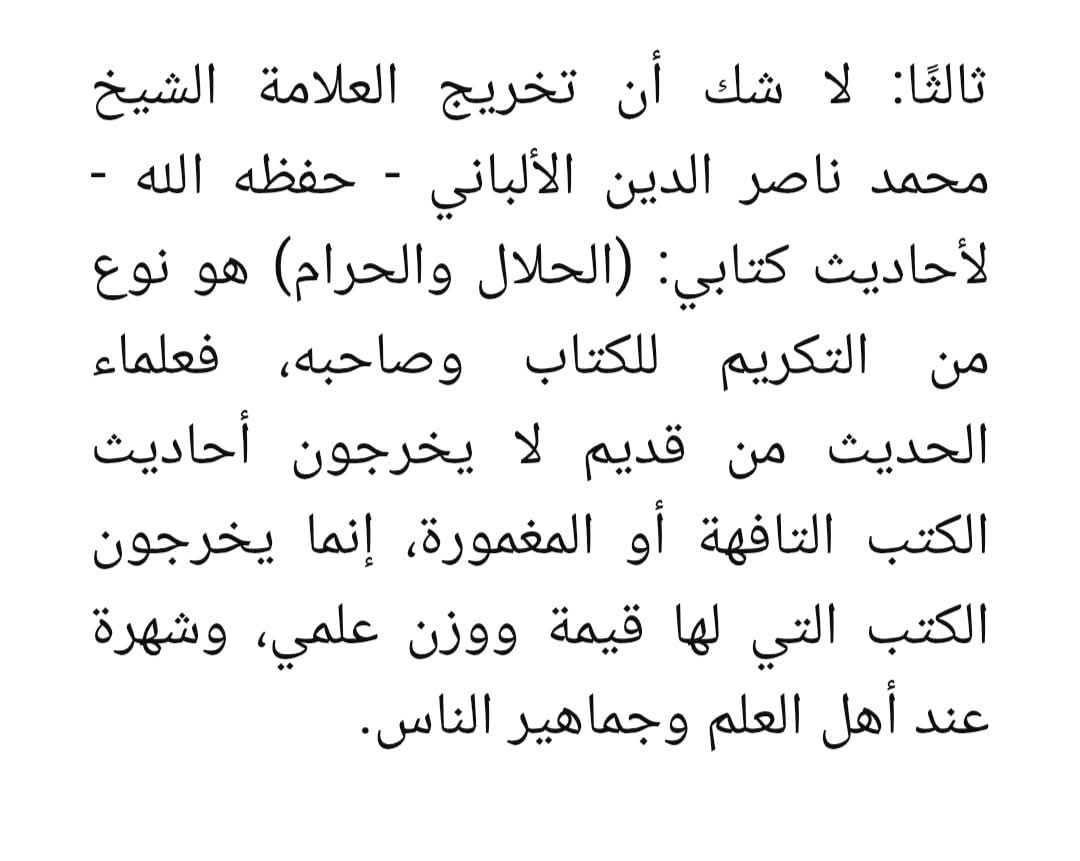 “Tidak ragu lagi, takhrij Hadits yang dilakukan oleh al-‘Allamah Muhammad Nashiruddin al-Albani hafizhahullah untuk Hadits-Hadits yang dimuat dalam kitab saya “Al-Halal wa al-Haram”, merupakan bentuk penghormatan bagi kitab ini dan penulisnya. Para ulama Hadits sejak dulu, tidak mentakhrij Hadits yang terdapat dalam kitab-kitab yang tidak penting atau tidak bermanfaat. Mereka hanya mentakhrij Hadits yang terdapat dalam kitab-kitab yang memiliki nilai dan bobot ilmiah, serta masyhur di kalangan ulama dan masyarakat umum.”