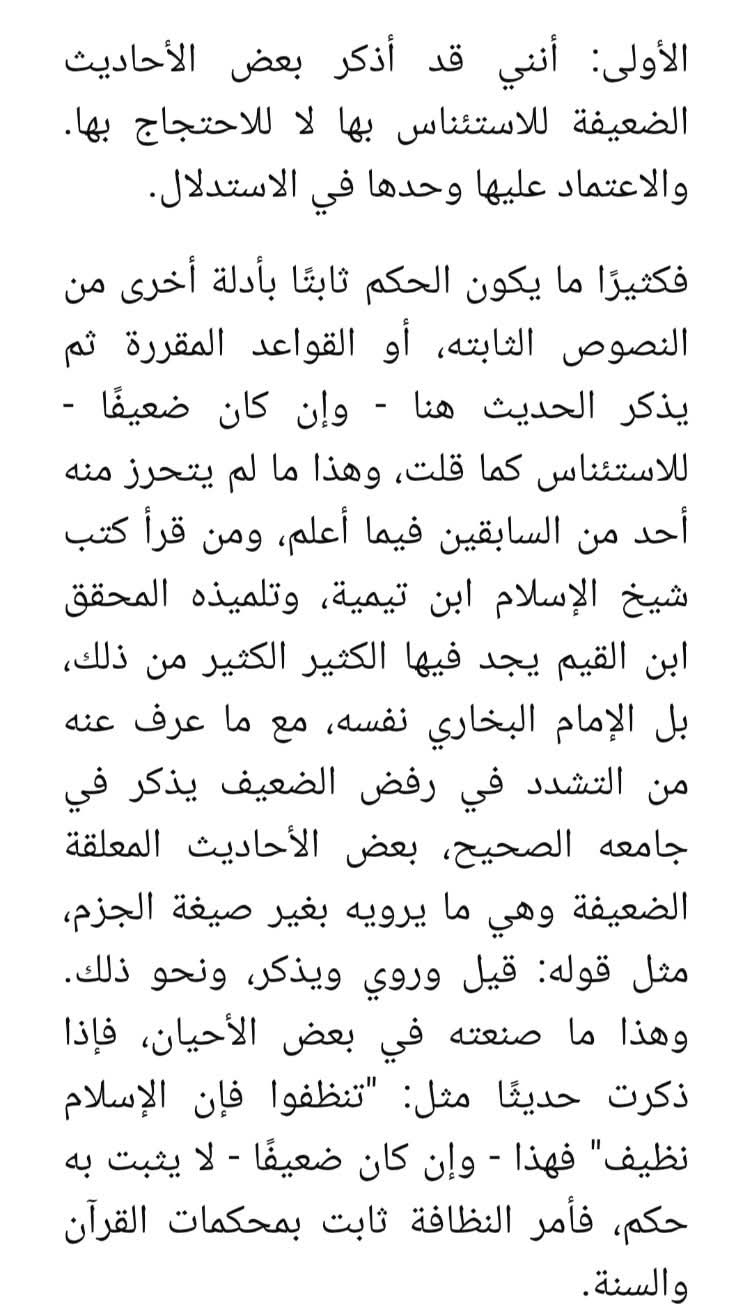 “Saya kadang menyebutkan sebagian Hadits-Hadits dhaif untuk isti’nas (argumen pendukung atau tambahan, bukan dalil utama), bukan untuk ihtijaj (sebagai hujjah dan dalil utama), juga tidak menjadikannya sebagai satu-satunya sandaran dalam berdalil.