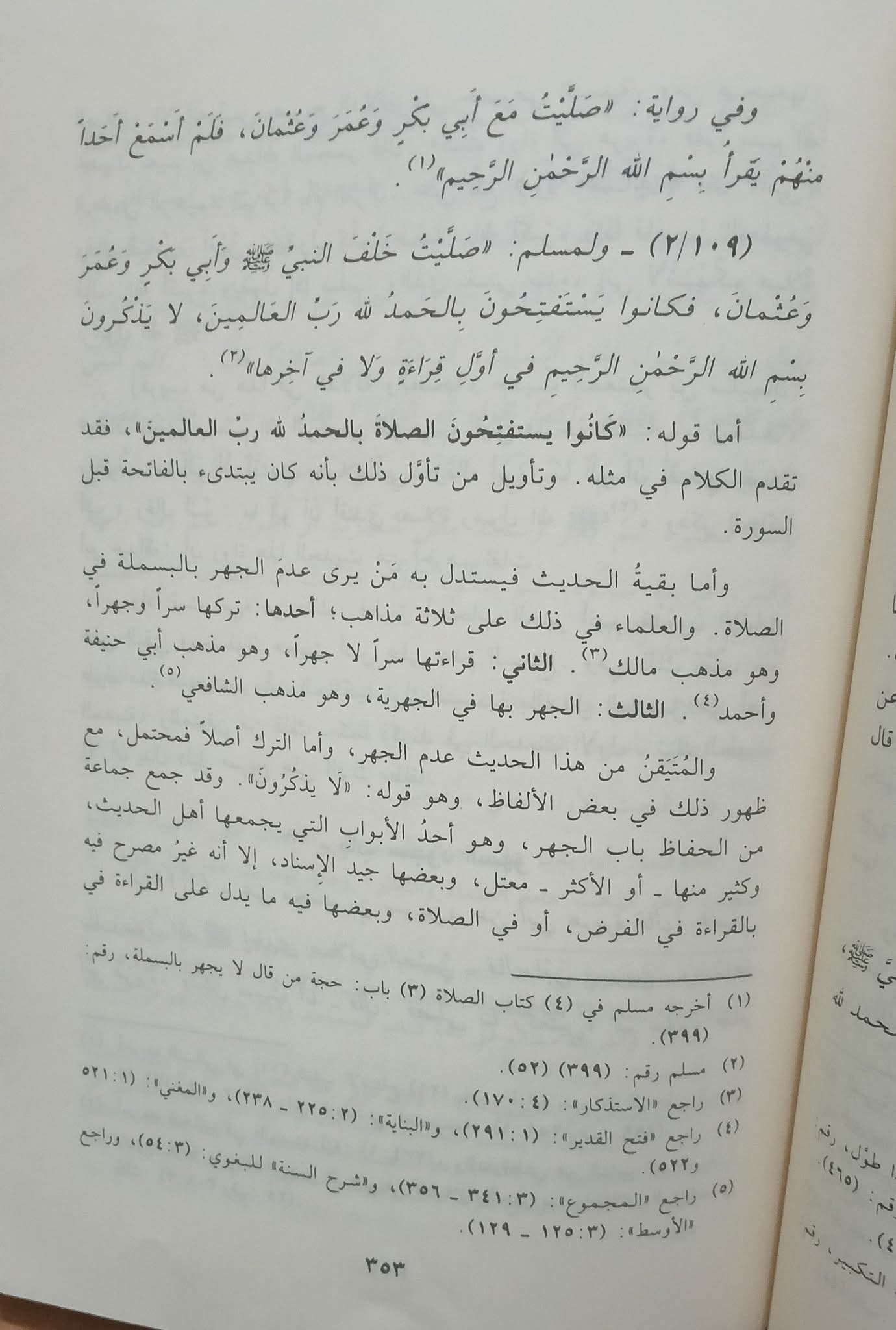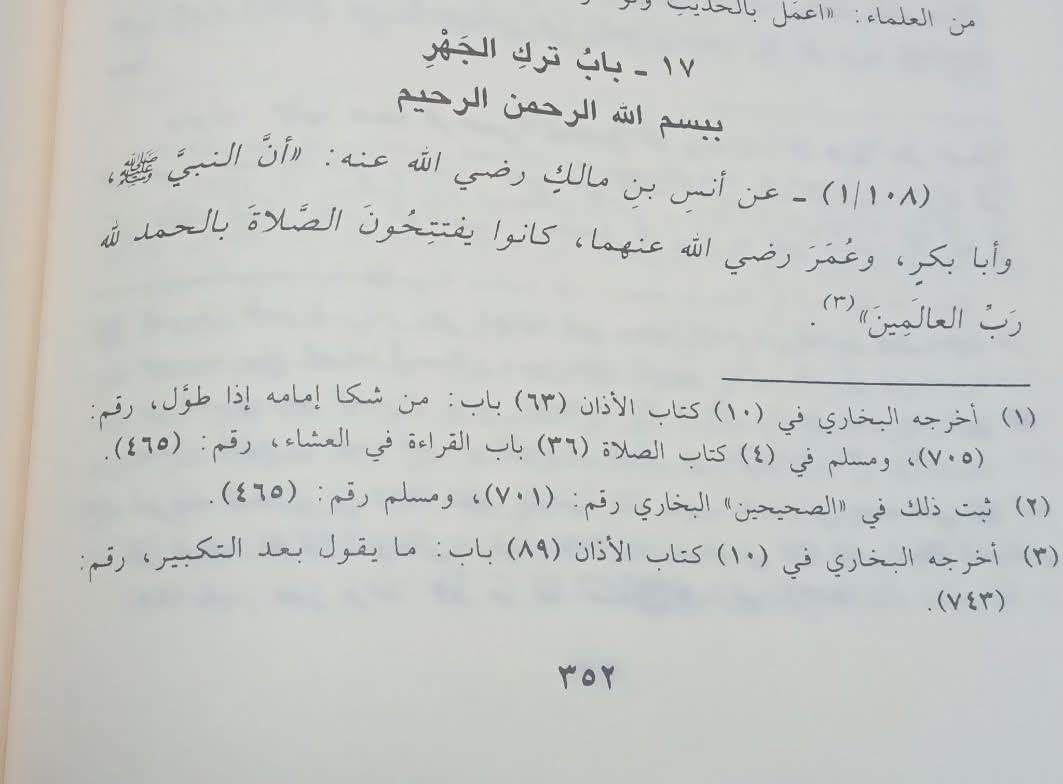 Imam Taqiyuddin Ibnu Daqiq al-‘Id, setelah menyampaikan Hadits Anas bin Malik radhiyallahu ‘anhu dalam “Ihkam al-Ahkam” menyatakan: “Hadits ini digunakan sebagai dalil oleh ulama yang berpendapat bahwa basmalah tidak dibaca secara jahr (nyaring) saat shalat.” Beliau lalu menyampaikan, dalam persoalan ini, para ulama terbagi menjadi tiga pendapat, yaitu: