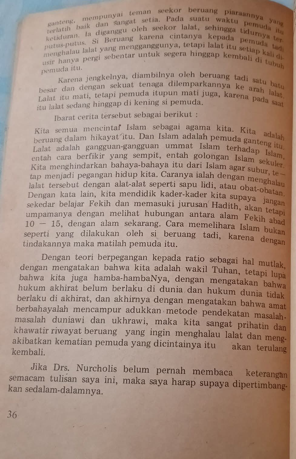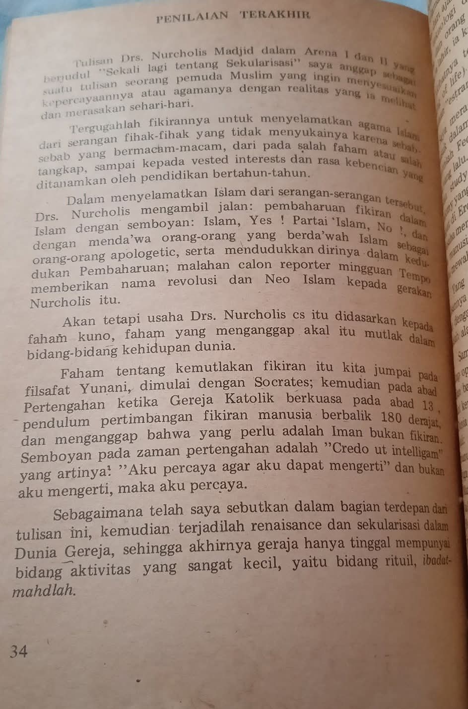 “Yang digambarkan oleh Drs. Nurcholis sebagai dasar dari tulisannya ialah bahwa Islam menganjurkan orang untuk berfikir, dan dengan fikiran orang dapat mengatasi semua problemnya, adalah alam fikiran Barat sampai permulaan abad ke 20.”