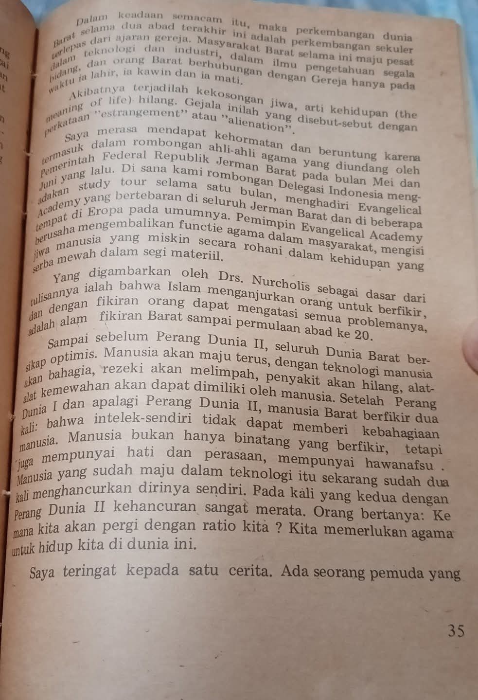 “Setelah Perang Dunia I dan apalagi Perang Dunia II, manusia Barat berfikir dua kali: bahwa intelek-sendiri tidak dapat memberi kebahagiaan manusia. Manusia bukan hanya binatang yang berfikir, tetapi juga mempunyai hati dan perasaan, mempunyai hawanafsu. Manusia yang sudah maju dalam teknologi itu sekarang sudah dua kali menghancurkan dirinya sendiri.”