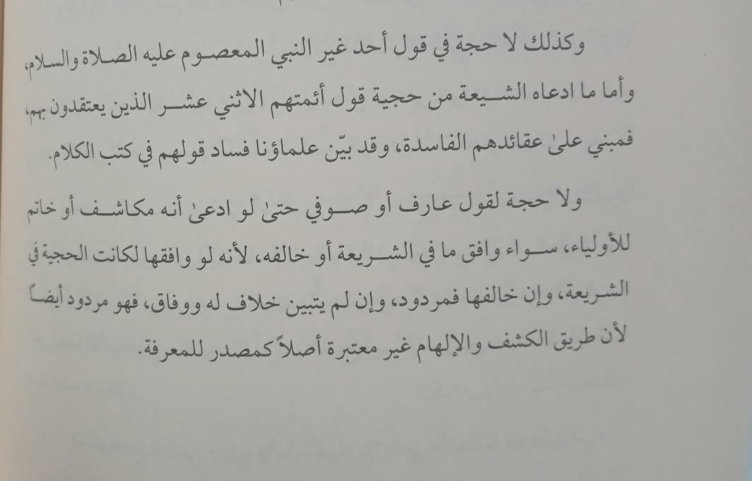 Demikian juga, perkataan seorang sufi atau ahli makrifat, meskipun dia mengklaim telah mencapai kedudukan tertinggi dalam kewalian atau telah mendapatkan kasyaf, baik perkataan itu sesuai syariat atau menyelisihinya. Jika perkataannya sesuai syariat, maka yang menjadi hujjah adalah syariat tersebut, bukan perkataannya. Jika menyelisihi syariat, maka kata-katanya otomatis tertolak. Jika tidak jelas, apakah menyelisihi syariat atau tidak, perkataan tersebut juga tertolak, karena pada dasarnya metode kasyaf dan ilham bukanlah sumber pengetahuan yang bisa menyampaikan pada kebenaran dan hakikat sesuatu (mashdar lil ma’rifah).