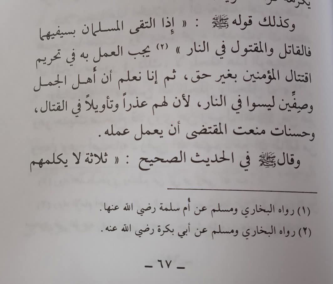 Namun, kita mengetahui bahwa kaum muslimin yang terlibat dalam Perang Jamal dan Perang Shiffin tidak termasuk ke dalam ancaman neraka ini, karena mereka memiliki uzur dan takwil atas peperangan yang mereka lakukan, juga mereka memiliki banyak sekali kebaikan, yang mencegah berlakunya ancaman ini untuk mereka.